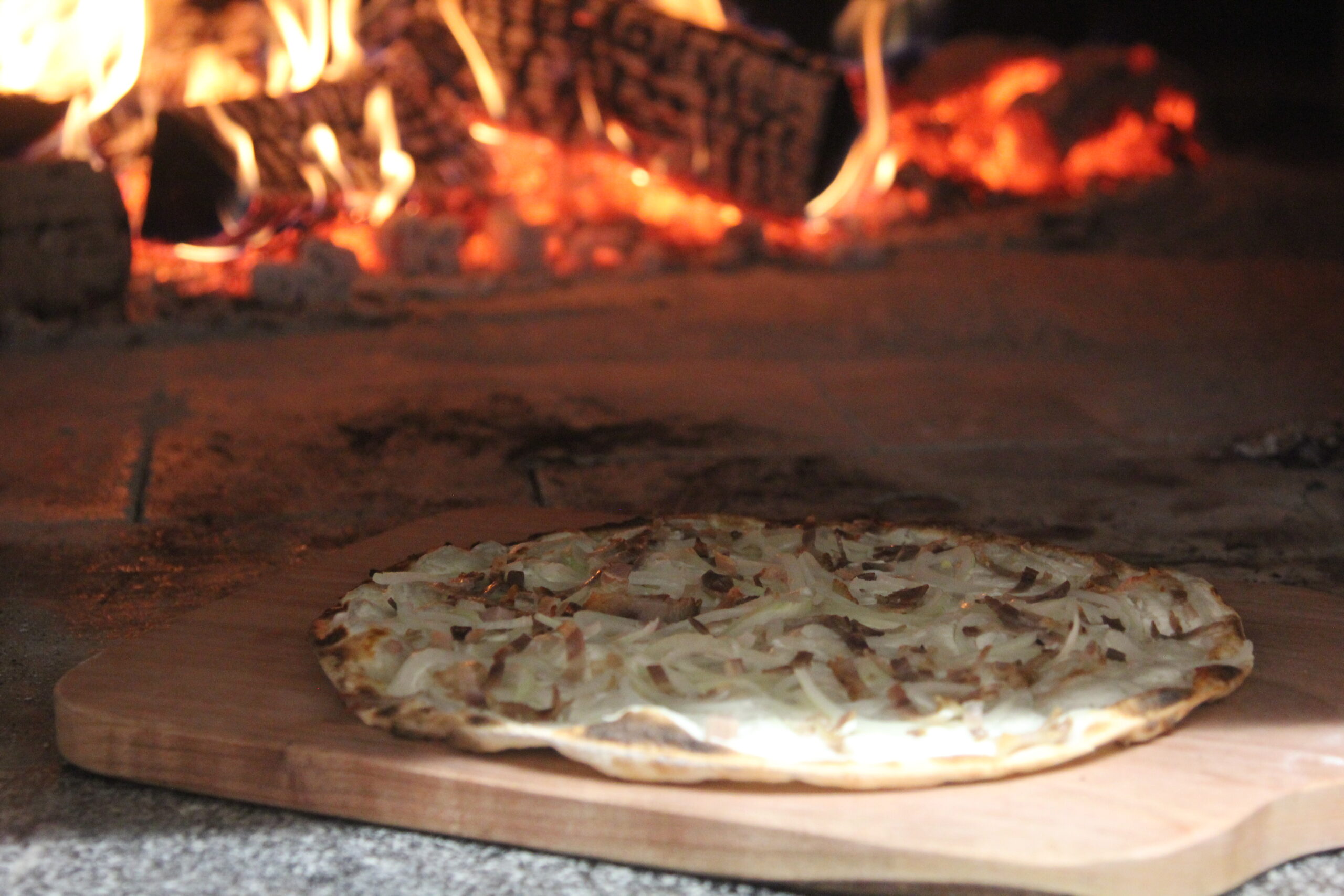 En plat ou en apéritif, nos tartes flambées cuitent au feu de bois réveilleront vos papilles !