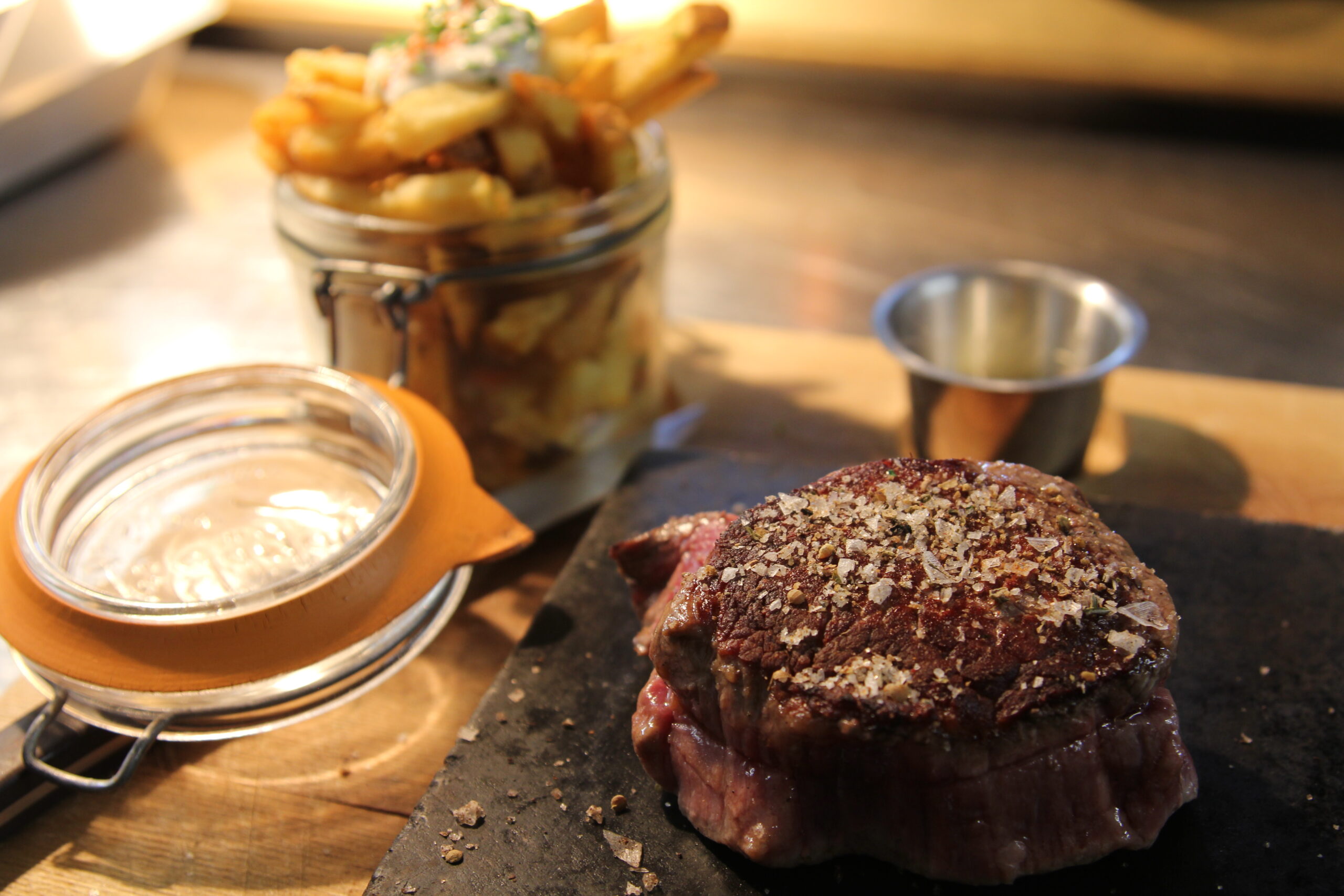 Sur une pierre chaude, dégustez un filet de boeuf de 200g, beurre maître d'hôtel, et adaptez la cuisson à votre guise.