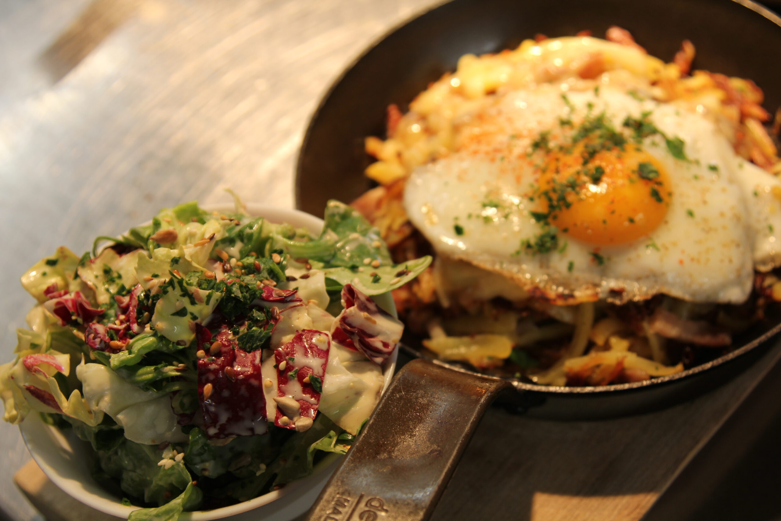 Des pommes de terre savoureuses servies dans une poêle avec son fromage, son oeuf et ses lardons, accompagné d'une salade verte.